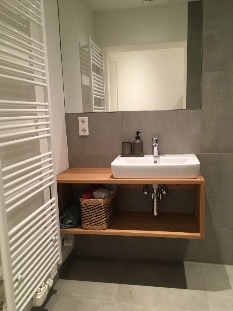 Das moderne Badezimmer ist mit einer begehbaren Dusche, Fußbodenheizung und einem WC ausgestattet.