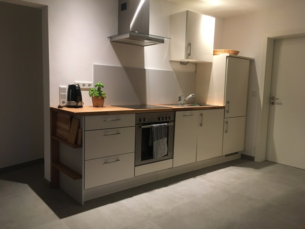 Die Wohnung verfügt über eine voll ausgestattete Einbauküche (Kühlschrank mit Gefrierfach, Backofen, Spülmaschine) sowie einen Essbereich für bis zu vier Personen. Kinderstuhl auf Anfrage möglich.